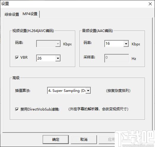 6、然后切换到格式设置面面板,在此设置格式的转换码率和需要使用的插值算法等,设置完成后点击确定。